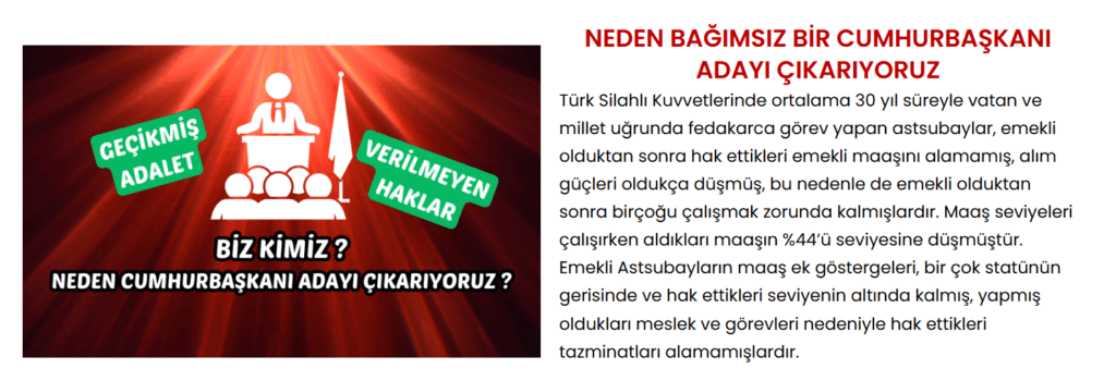 Türkiye’nin siyasi sahnesi, her daim beklenmedik figürlerle yeniden şekillenme potansiyeli taşır. Bugün, bu potansiyelin en somut ve halkçı örneklerinden birini inceleyeceğiz: cumhurbaskaniadayimiz.com. Bu site, emekli astsubayların uzun yıllara dayanan mağduriyetlerini bir manifesto gibi sergileyerek, bağımsız bir cumhurbaşkanı adayı çıkarma vizyonunu ortaya koyuyor. Bu, salt bir web platformu değil; Türk Silahlı Kuvvetleri’nin omurgasını oluşturan emekli astsubayların sesini, ulusal siyasetin merkezine taşıma girişimi.
