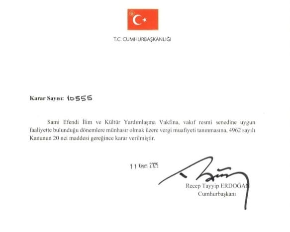 AKP’li Cumhurbaşkanı Recep Tayyip Erdoğan, Erenköy Cemaati’yle bağlantılı Sami Efendi İlim ve Kültür Yardımlaşma Vakfını da “vergiden muaf vakıf” statüsüne aldı. Karar, 25 Kasım 2025 tarihli Resmî Gazete’de yayımlanarak yürürlüğe girdi.