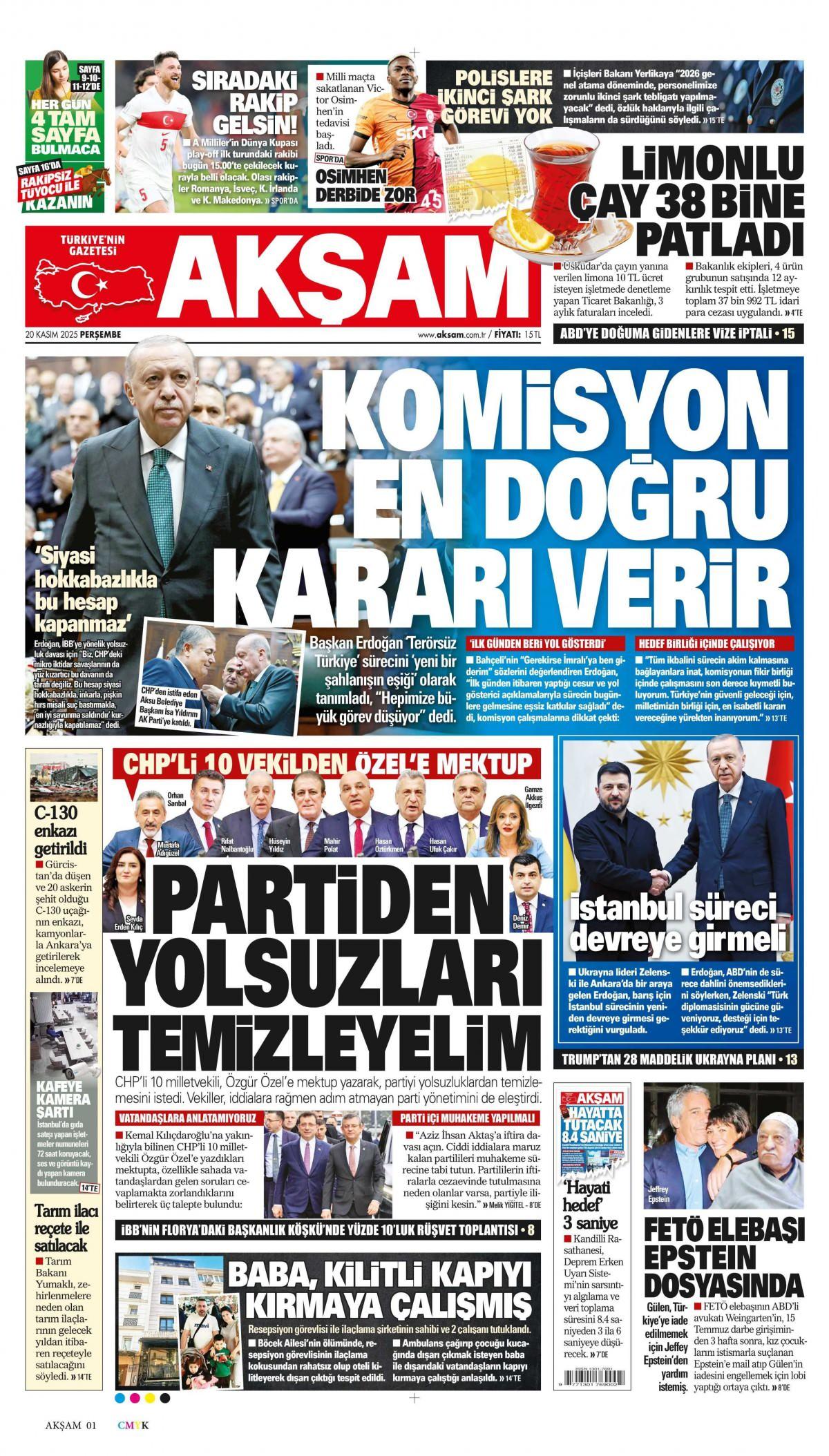 Akşam Gazetesi 21 Kasım 2025 Günü Manşeti