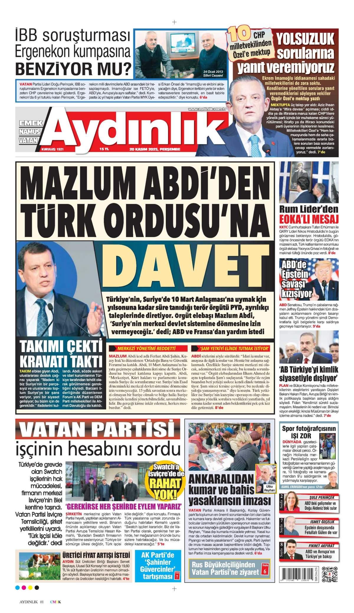Aydınlık Gazetesi 21 Kasım 2025 Günü Manşeti