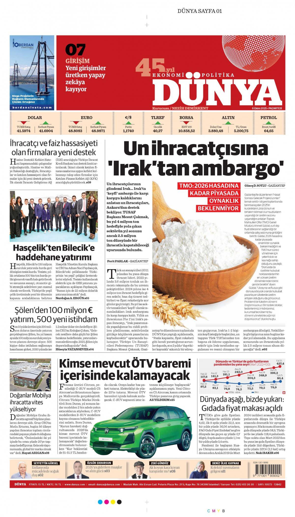 Dünya Gazetesi 6 Ekim 2025 Günü Manşeti