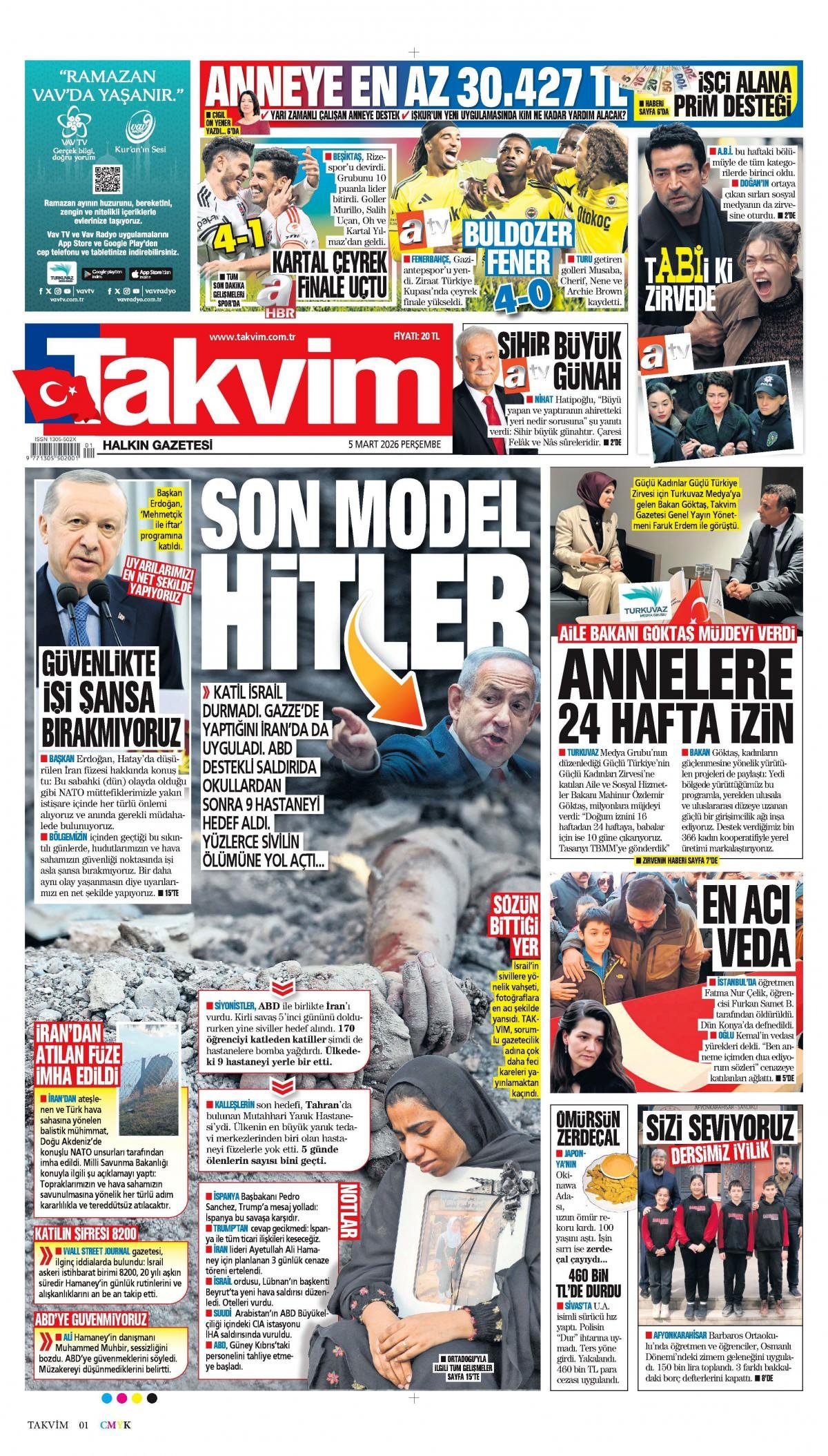 Takvim Gazetesi 5 Mart 2026 Günü Manşeti